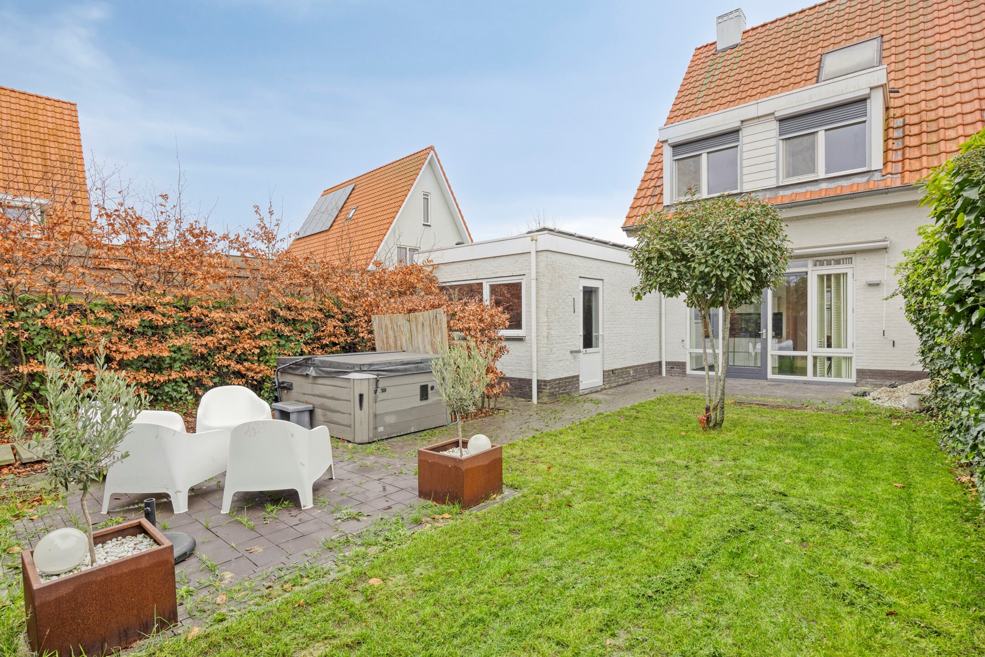 De achtertuin is gelegen op het oosten en beschikt over twee terrassen. In de tuin is een jacuzzi aanwezig.
