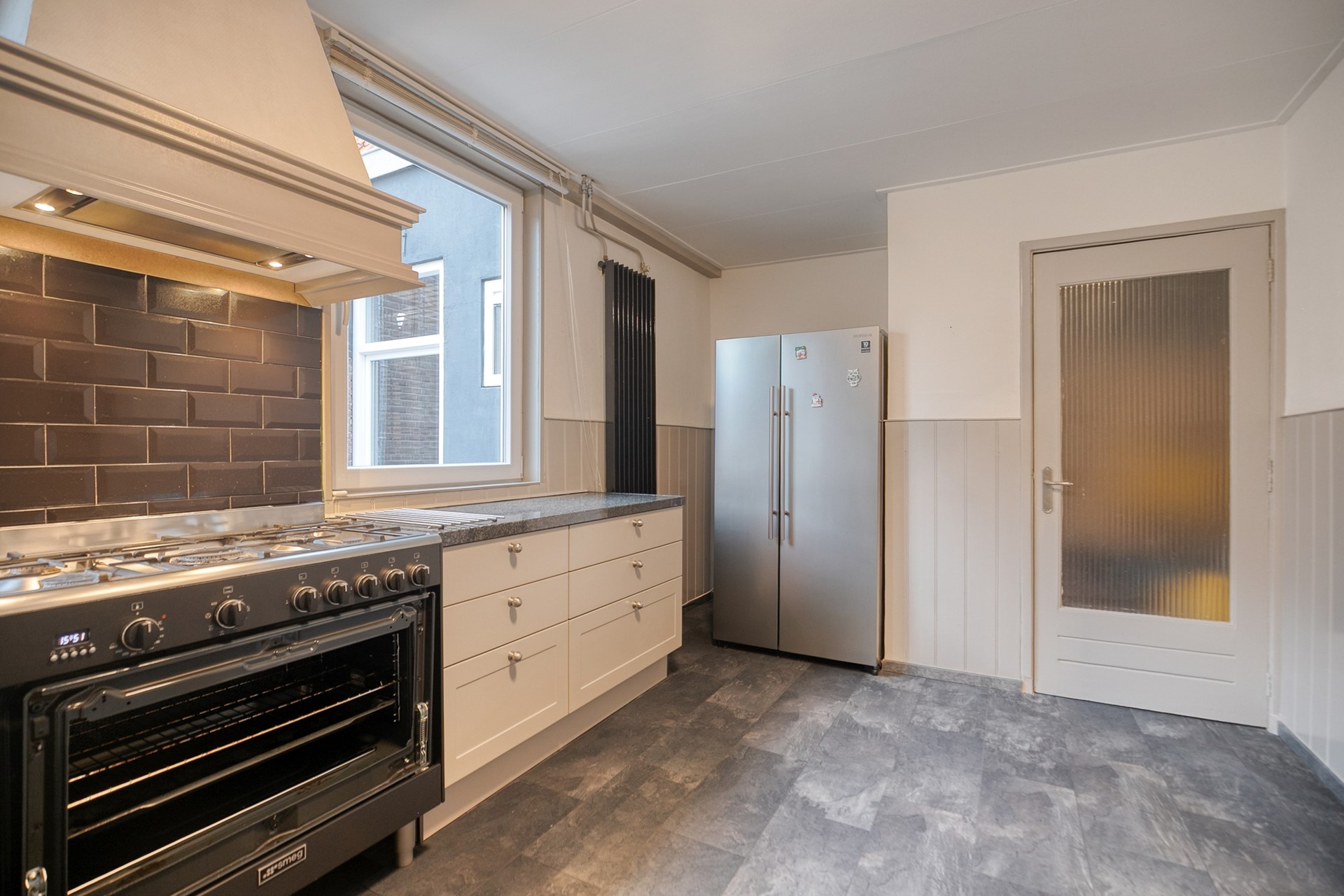 De woning begint op de eerste verdieping, bereikbaar via een trap achter de winkelruimte. Hier bevindt zich een royale woonkamer, een moderne Brugman-keuken (2018) met granieten werkblad en hoogwaardige inbouwapparatuur, waaronder een Smeg-oven met 5-pits gasfornuis en een klassieke afzuigschouw. Verder zijn er een ruime slaapkamer met inpandige serre, een vernieuwde badkamer (2021) met inloopdouche en wastafel, een apart toilet (2021) en een praktische ruimte voor wasapparatuur met veel opbergruimte.